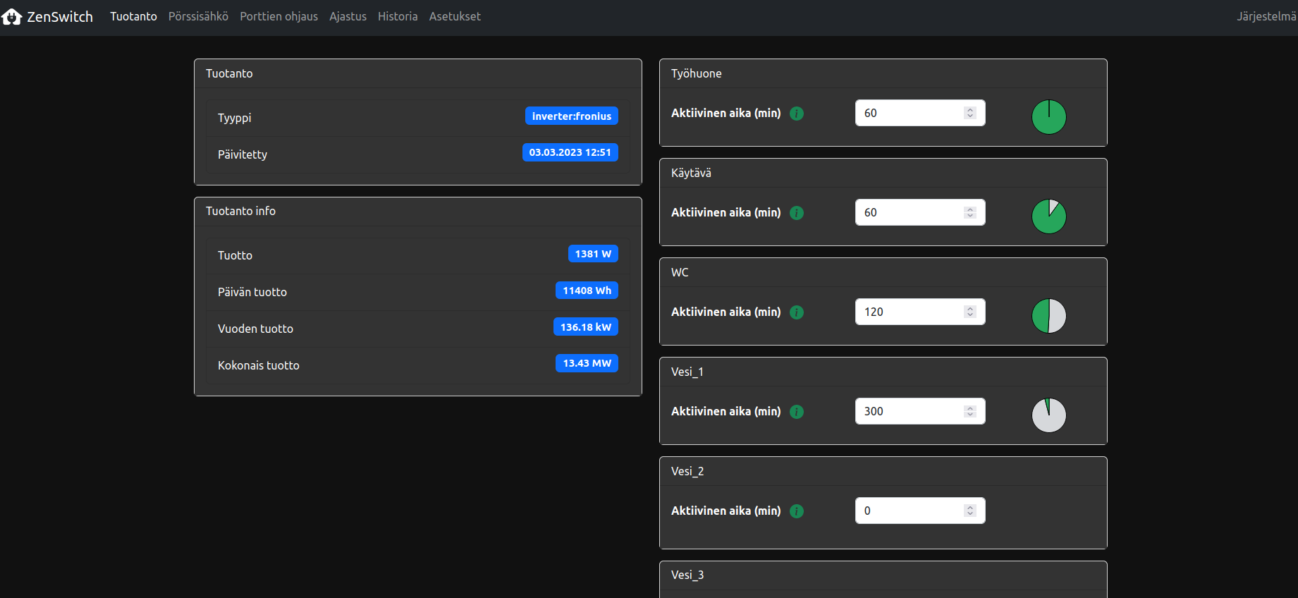 ZenSwitch käy lukemassa invertteriltä (** lisätietoa sivun lopussa), paljonko sähköntuotanto on ja sähkölaitteita voidaan kytkeä